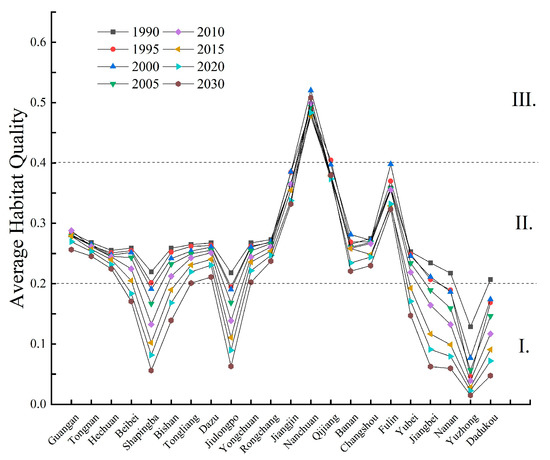 Changes in average habitat quality across different regions of the Chongqing metropolitan area from 1990 to 2030.