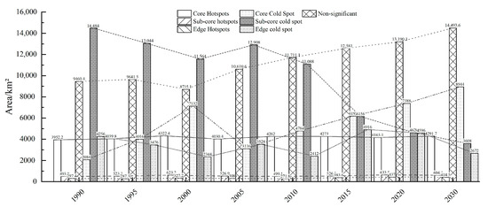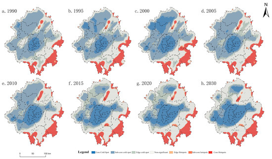 As shown in Figure 6 and Figure 7, From 1990 to 2030, the hotspots and cold-spots of habitat quality exhibit significant spatiotemporal variations. In terms of time, although the hotspots generally show an increasing trend in area, the fluctuations are relatively small. On the other hand, the cold-spots, except for the core cold-spot area, experience a notable decrease in area for both the sub-core cold-spot and the edge cold-spot regions, with larger fluctuations. Spatially, the hotspots are mainly concentrated in the southeastern part of the study area, while the cold-spots are predominantly distributed in the central region. Over the 40-year period, the hotspots demonstrated relative spatial stability, while the cold-spots exhibited a significant expansion phenomenon, radiating extensively from the core region in the center towards the western part of the study area.