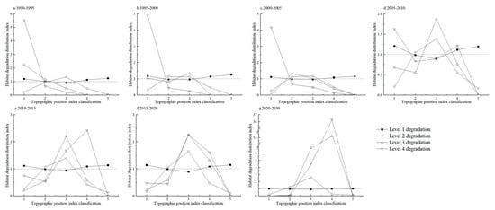 In the equation, represents the distribution index. represents the area of habitat degradation of level at the terrain position gradient level . represents the total area of level habitat degradation, while represents the total area within terrain position gradient level . When the distribution index of habitat degradation is greater than 1, it indicates a dominant position, whereas if it is less than 1, it indicates a subordinate position. Within the same terrain position gradient level, comparing the distribution indices of different levels of habitat degradation, a higher distribution index indicates a higher dominance of habitat degradation at that gradient level.