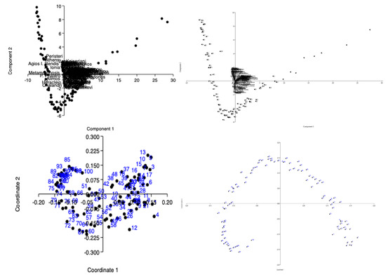 To illustrate (global and local) profiles of soil sealing in metropolitan Athens, descriptive statistics were run with the aim of providing a coherent delineation of the spatial degree of land imperviousness using tables, graphs, and maps [54]. Additionally, a multivariate strategy based on a composite chain of five separate techniques was adopted here to summarize the complex relationship at the base of land imperviousness profiles in Athens as a contribution to planning design and policy implementation for urban footprints’ containment and metropolitan sustainability at large [49]. More specifically, the (multivariate) latent relationship between the spatial extent of the different soil sealing classes in each municipality (namely, the local-scale ‘footprint profile’) of metropolitan Athens was studied over time (2006 and 2018, see Figure 1) considering the results of five statistical analyses run sequentially. Techniques included a Principal Component Analysis (PCA), a Principal Coordinate Analysis (PCoA), a non-metric Multidimensional Scaling (n-MDS), a Correspondence Analysis (CA), and a Detrended Correspondence Analysis (DCA). All these techniques were aimed at decomposing complex data matrices by variable, using criteria oriented toward the ‘correlation’ notion (PCA and, in part, PCoA), the ‘similarity’ notion (nMDS), or the association notion (CA, DCA).