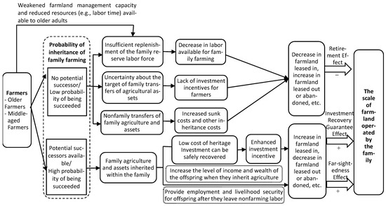 Theoretical framework for analyzing the relationship between the probability of intergenerational inheritance and the scale of farmland operated by the family in China. Note: “+” indicates positive impact; “−” indicates negative impact.