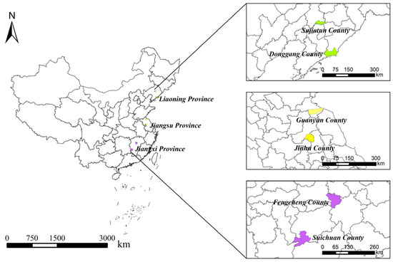 The data were obtained from field research conducted in 2019 in the representative provinces of Liaoning, Jiangsu, and Jiangxi in East China. Liaoning, Jiangsu, and Jiangxi Provinces, located in northeastern, central-eastern, and southeastern regions of China (see Figure 2), respectively, have representativeness in terms of farmland resource endowment, aging population, and development of farmland scale management. The research sample selection was mainly determined by multistage sampling. First, based on the geographical location, distance from the provincial capital city, and economic development level, the survey selected six representative counties, namely, Sujiatun, Donggang, Guanyun, Jinhu, Fengcheng, and Suichuan. Second, five townships were selected in each county by systematic random sampling based on the ranking of land endowment in each county, and then four sample villages were identified in each township based on the ranking of village farmland in each township by a similar method. Finally, 12 farming households were randomly selected in each village. Through interviews and structured questionnaires, the survey sample covered 6 counties, 30 townships, and 120 villages in Liaoning, Jiangsu, and Jiangxi Provinces, and a total of 1420 effective questionnaires were obtained from farming households. Considering the theme of this study and the legal marriage age (aged 22 and above for males and 20 and above for females) and labor force age (aged 16 and above) in China, married farmers who had children aged 16 and above to inherit agriculture had to be at least 40 years old (male) or 38 years old (female). Therefore, after eliminating samples missing key information, 1347 valid samples whose household heads were 40 years old or older were finally selected for empirical research. Among them, 459 were from Liaoning, 457 were from Jiangsu, and 431 were from Jiangxi.