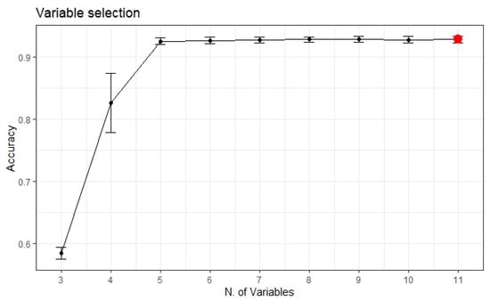 Figure 2. Model accuracy across different model sizes. Red dot represents the optimum number of variables.