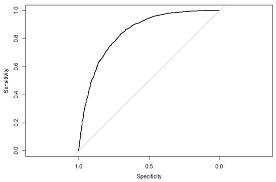 The predictive performance of the model was satisfactory; the SVM model yielded a high AUC 0.84 (Figure 3). We observed a clear gap (Kruskal–Wallis test significant; p < 0.05) (Figure 4) that separated the predicted probability between deforested and non-deforested observations. The density plots corroborated the high contrast between categories (Figure 4). In non-deforested locations, we found a frequency peak close to 0.1, after which the curve flattened. In deforested locations the probability peaked near 0.9, decreasing fast into low density values below the 0.8 threshold. Overall, all diagnoses provided proof of the satisfactory performance of the models, which supported our findings.
