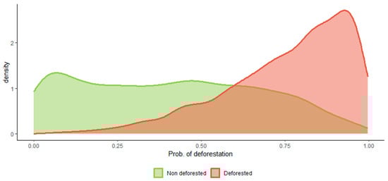 Figure 4. Density histograms of predicted probability classified as deforested (red) and non-deforested (green).