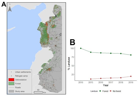 In March 2011, the devastating armed conflict that erupted in Syria left more than 13 million people in need of assistance, causing the migration abroad of more than 5 million people and displacing more than 6 million people internally in the country [29]. About 1.4 million refugees fled to the Syrian coastline region [30], which comprises 90% of the country’s forests, with forest ecosystems that are vital for carbon storage, timber, biodiversity, and recreational uses [31,32].