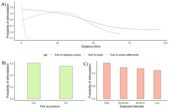 Figure 6. Partial dependence plots. (A) Represents the marginal effect of continuous variables (the Euclidean distance to the refugee camp, the Euclidean distance to the nearest road, and the Euclidean distance to the nearest village) in deforestation probability. (B) Represents the marginal effect of binary variables (fire occurrence). (C) Represents the marginal effect of categorical variables (weapons explosion intensity) on deforestation probability.