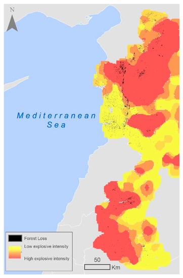 Ref. [95] also reported that forest fires in the northern Al-Kabeer River basin of the northern Province of Latakia in Syria in 2012–2014 were mainly caused by the war and the firing of shells and bombs in the area. These findings support our conclusion that shelling and bombing can be major causes of forest fires and deforestation.