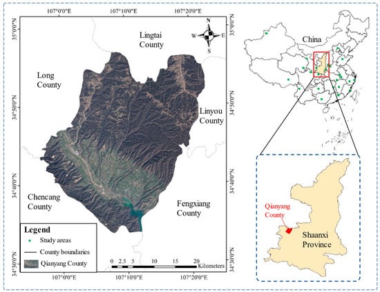 Qianyang County is located in the western region of Shaanxi Province. Qianyang County borders Lingtai County in Gansu Province to the north, Chencang District in Baoji City, Shaanxi Province to the south, and Long County in Baoji City to the west. The area of the county is 996.46 square kilometers, and the population of the county is about 131,000 as of 2021; the location of Qianyang County in China is shown in Figure 2. Qianyang County is located in the western hilly and ravine area of the Weibei Plateau, with complex and diverse terrain. It is mountainous in the north and south, and the southern part of the county is the Wu Yue branch of Arrowhead Ridge, with an elevation of about 1000–1502 m. In the north is Qian Mountain, with an elevation of 1000–1545 m. The total area of the mountainous region is 782.31 square kilometers, accounting for 78.5% of the total area of the county. The central part of Qianyang County is a faulted basin with the Qian River passing through it, dividing the area into more than 20 irregular loess remnants. The area is 138.7 square kilometers, accounting for 13.9% of the total area. Qianyang County has a warm temperate semi-humid continental monsoon climate with an annual average precipitation of 677.1 mm and an annual average temperature of 10.9 °C. The northern Qian mountains are a warm and humid agricultural, forestry, and animal husbandry area with an average annual temperature of 8.7 °C, annual precipitation of 562.8 mm, low humidity, and low precipitation. The central region is a warm and humid grain-producing area with an average annual temperature of 10.8–11.5 °C and an average annual precipitation of 653.0 mm. The topography of Qianyang County varies greatly from region to region, and it is a transition area where different landform types such as loess plateau, Weihe Basin, and Qinling–Longshan Mountains intersect. Geological environmental conditions are complex and changeable, resulting in frequent geological hazards and a fragile ecological environment. Typical geological hazards in the region mainly include landslides, cave-ins, mudslides, and unstable slopes, which are some of the most serious geological hazards in Shaanxi and even nationwide [35].