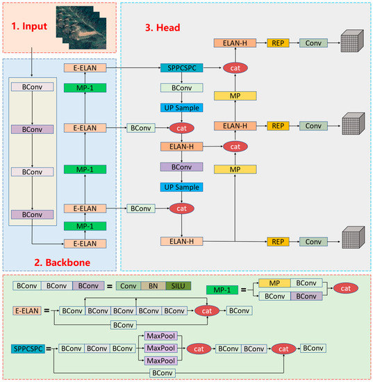 Due to its high recognition accuracy and fast computation speed, YOLO has become one of the most popular algorithms in the target detection category and is widely used in various industries, such as the processing of remote sensing images and real-time target detection [40]. YOLOv7 is one of the latest models in the YOLO series and, compared to other models in the YOLO series, YOLOv7 has higher computational accuracy and faster computational speed [41,42,43]. The YOLOv7 model contains three main modules, which are the input layer (input), the backbone network (backbone), and the head module (head). The main role of the input layer in YOLOv7 is to pre-process the input images and align them uniformly into RGB images of 640 × 640 × 3 in size, called image pre-processing, and its position in the whole algorithm model is shown by the pink background in Figure 4. The YOLOv7 backbone network functions as a feature extractor, a two-stream network architecture based on the CSPDarknet53 architecture, which contains two branching sections responsible for extracting pixel features in horizontal and vertical directions, respectively. It is followed by a global averaging pooling layer that is used to aggregate the feature values extracted earlier and turn them into a fixed-size feature vector. Thus, the role of the backbone network is to extract the features of the input image during training and then apply these useful features in predicting the location and class of the target object, whose structure is shown by the blue area in Figure 4. The head module, also called the detection head, mainly includes the loss function part and the corresponding optimization strategy. The head module in YOLOv7 uses the auxiliary head training and the corresponding positive and negative sample matching strategy for the first time, which can improve the performance and increase the training speed by multi-way branching during the training process, and its structure is shown in the grey area in Figure 4.