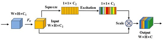 - Scale Operation. The activation value of each channel ( is the sigmoid activation function, the value is 0–1) and the original feature value are multiplied to obtain the weight coefficient of each channel after the operation, which makes the model more discriminative for the features of each channel. The scale operation is represented as follows:
