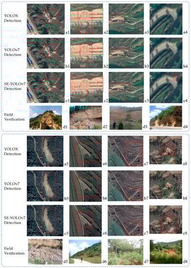 Therefore, Figure 8 shows that landslide detection using YOLOX and YOLOv7 has more missed detections when the image contains multiple landslides while, in contrast, the improved SE-YOLOv7 model proposed in this paper has more complete and accurate detection results.