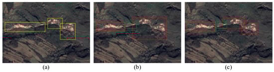 Real landslides and detection results of YOLOv7 model and SE-YOLOv7. Image (a) shows the location of the landslide, image (b) is the result of YOLOv7 detection, image (c) is the result of SE-YOLOv7 detection. The yellow box shows the actual location of the landslide. The red box in the pictures is the landslide identification box, the green box is the missed detection box of the landslide.