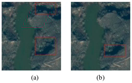 Detection results of YOLOv7 model and SE-YOLOv7 model. There are no landslides in the image. Image (a) is the result of YOLOv7 detection, image (b) is the result of SE-YOLOv7 detection. The red box in the pictures is the landslide identification box.