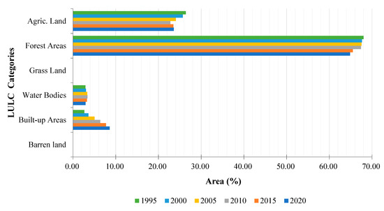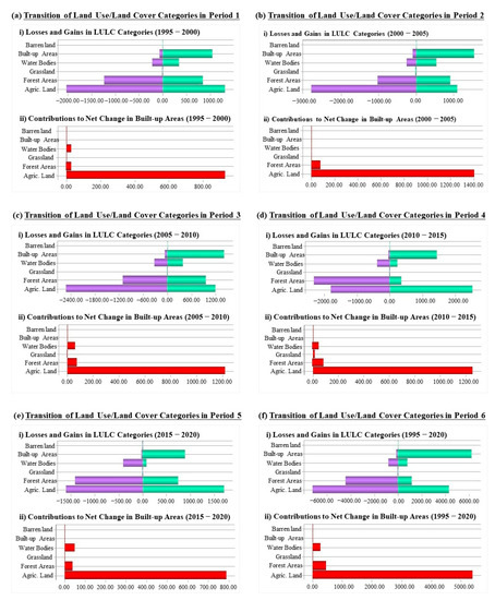 We analyzed the change dynamics of the six (6) categories of land uses during the historical period between 1995 and 2020 using a time span of five (5) years. The results are presented in Figure 5, which indicates numerous variations in the study area’s LULC categories with notable losses and gains and the contributions of the different land uses to the urban growth of the province.