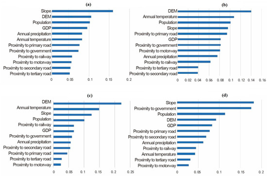 Figure 7c,d depict the contribution of each variable to the changes in water bodies and built-up areas. Slope had the most significant influence on changes in built-up areas, followed by proximity to government and population. The built-up areas expand outward around the various administrative centers in the major cities of the province. Such cities have constantly attracted large urban population, contributing to the study area’s rapid urbanization.