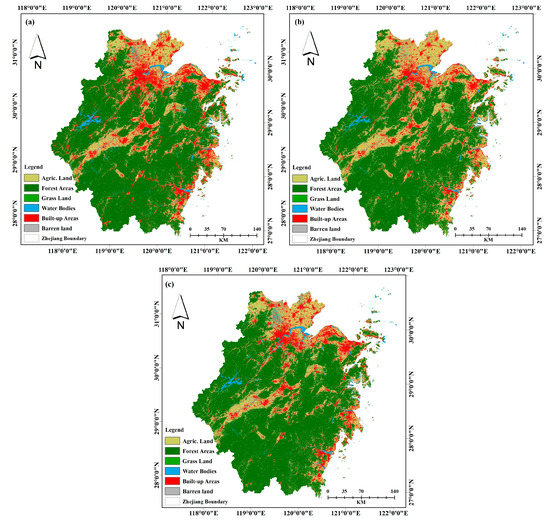 The PLUS model was validated using the LULC maps of Zhejiang Province in 2015 and 2020. The validation result indicated a significant consistency between the real and simulated maps of 2020, as shown in Figure 9. It presented an accuracy of 95.60% and a Kappa coefficient of 0.915, suggesting a satisfactory simulation model. Hence, the validated PLUS model can effectively predict future LULC.