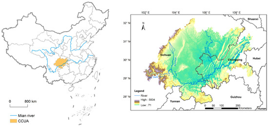 CCUA is located in Southwest China (101°57′56″ E–108°56′40″ E, 27°40′31″ N–32°19′21″ N) (Figure 1). It borders Hubei in the east, and Yunnan and Guizhou in the south, comprising 15 cities in Sichuan Province and 29 districts and counties in Chongqing, with a total area of approximately 185,000 km2. CCUA has a subtropical monsoon climate, with annual average temperature of 16–18 °C and annual precipitation of 900–1200 mm. It is located in the Sichuan Basin and is upstream of the Yangtze River, with an altitude of 71–5834 m. The terrain is relatively low in the middle and surrounded by mountains in the southwest and east, mainly including plains, hills, and mountains. The highest elevation in CCUA is represented by the Hengduan Mountains in the western part, and the eastern part comprises the parallel mountains and valleys in the east of Sichuan. With dense river network and developed irrigation water system, the area enjoys the reputation of being a “Land of Abundance”. The Yangtze River runs through the south of the region from west to east, and important rivers such as the Wujiang River, Minjiang River, Jialing River, and Dadu River also flow through the study area.