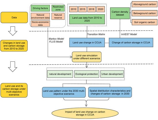 This study combined the FLUS model and the InVEST model to analyze and simulate carbon storage and its change in the terrestrial ecosystem of CCUA (Figure 2). First, based on land use data and carbon density data, the change in land use and carbon storage in CCUA from 2010 to 2020 was analyzed. Then, combined with historical land use change patterns, the Markov model was used to predict the number of future land use changes. Using the driving factors of land use change and the data of the restricted zone, the FLUS model was used to simulate land use change under three scenarios of natural development, ecological protection, and urban development. Finally, the InVEST model was used to predict the spatial distribution characteristics and changes in carbon storage under three scenarios in 2030, and to explore the impact of land use change on carbon storage in CCUA.