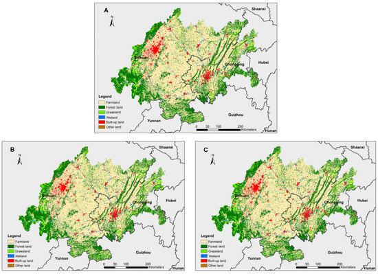 Considering different land types, the influences on carbon storage were analyzed (Table 8). The contribution of farmland to the carbon storage of CCUA was the largest, followed by forest land and grassland. The relatively large carbon storage of farmland can be attributed to the flat terrain in the central part of the study area, which is rich in purple soil, paddy soil, and yellow soil. The superior natural environment and historical farming habits have promoted the wide distribution of farmland in the region, making it an important part of carbon storage. Owing to their low carbon density, the contribution of built-up land and other land types to carbon storage was low in the region.