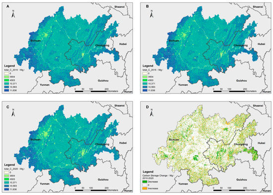 Spatial and temporal changes in carbon storage in CCUA from 2010 to 2020. (A–C) represent the carbon storage patterns of CCUA in 2010, 2015, and 2020, respectively. (D) shows the changes carbon storage from 2010 to 2020.