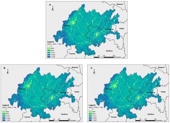The prediction of land use carbon storage in CCUA under multiple scenarios in 2030 is shown in Figure 6. Based on the multi-scenario land use pattern in 2030, predicted using the FLUS model, the InVEST model was used to calculate carbon storage under the three scenarios. The results showed that, compared with 2020, the total carbon storage remained the same under the ecological protection scenario, while the total carbon storage showed a downward trend under the natural development and urban development scenarios. Under the natural development scenario (Figure 6A), the carbon storage of CCUA reached 1837.74 × 106 Mg, reflecting the largest decrease with reference to the total carbon storage in 2020. Under the ecological protection scenario (Figure 6B), the carbon storage of CCUA reached 1844.68 × 106 Mg, reflecting an increase by 0.73 × 106 Mg compared with the total carbon storage in 2020. This is primarily attributable to the ecological protection measures adopted under this scenario, which limits the reduction in ecological land. Under the urban development scenario (Figure 6C), the carbon storage of CCUA decreased by 5.41 × 106 Mg.