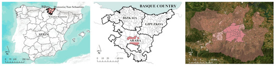 Figure 1. Location of the municipality of Vitoria-Gasteiz (right), capital of the Basque Country, in the Araba province (middle), which is one of the smaller peninsular provinces of Spain (left).
