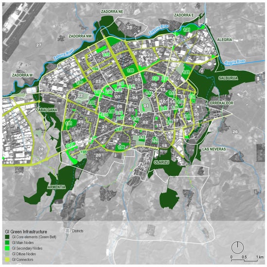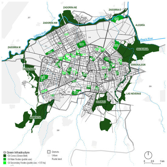 Figure 6. Vitoria-Gasteiz pedestrian network model (black lines) showing the most relevant elements of the GI system (cores, main nodes for public use, and secondary nodes for public use that are greater than 0.5 hectares), including district limits and urban and rustic land.