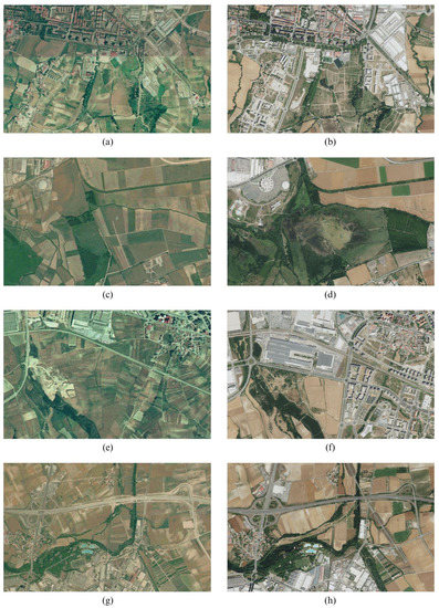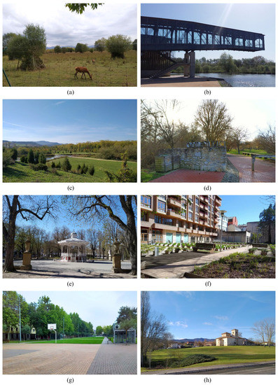 Figure 4. Some examples of the core elements and main nodes of the Vitoria-Gasteiz GI network: (a) core element 0.06, Salburua wetlands; (b) core element 0.06, Salburua Park Interpretation Center; (c) core element 0.03, Olarizu Park; (d) core element 0.02, the Armentia Park entrance; (e) main node 1.11, Florida Park; (f) main node 1.11, secret water garden in Florida Park; (g) main node 1.15, Judimendi Park; (h) main node 1.05, Armentia Fields.