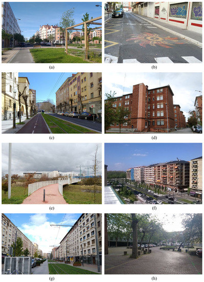Figure 5. Some examples of the elements included as part of the Vitoria-Gasteiz pedestrian network: (a) superblock-type street, Zabalgana neighborhood; (b) traffic-calming street, Eguzkilore Street; (c) single platform street, Nieves Cano Street; (d) pedestrianized spaces, Zaramaga neighborhood; (e) pedestrian itinerary in a green area, Arkaiate sector; (f) renaturalized street, Avenida Gasteiz Street; (g) urban path, Sancho el Sabio Street; (h) woonerf-style street, Flandes Street.