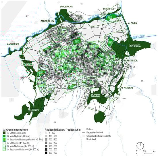 Figure 7. Vitoria-Gasteiz residential density, the pedestrian network model (black lines), the most relevant elements of the GI system (cores, main nodes for public use, and secondary nodes for public use that are greater than 0.5 hectares), and their 300 m influence areas, with district limits and urban and rustic land also shown.