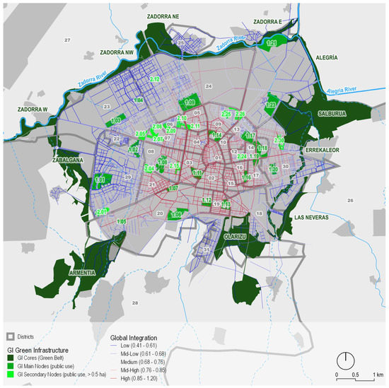 Figure 8. Global integration (IG) of the segments of the pedestrian network of Vitoria-Gasteiz and the most relevant elements of the GI system (cores, main nodes for public use, and secondary nodes for public use that are greater than 0.5 hectares), with district limits and urban and rustic land also shown. Low, mid-low, medium, mid-high, and high classifications of global integration values are included according to quintiles.