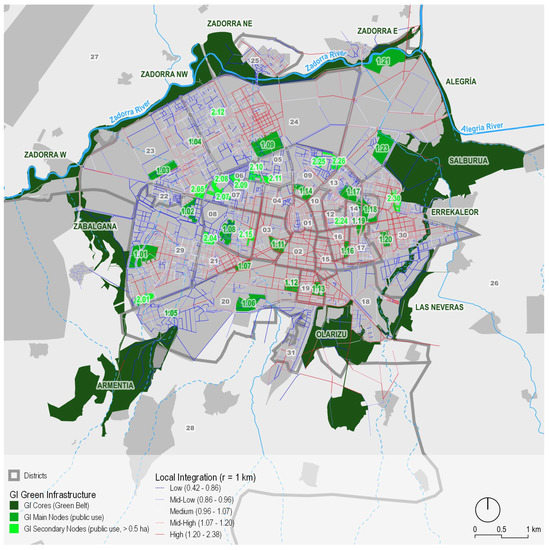 Figure 9. Local integration for 1 km radius (I1.0) segments of the pedestrian network of Vitoria-Gasteiz and the most relevant elements of the GI system (cores, main nodes for public use, and secondary nodes for public use that are greater than 0.5 hectares), with district limits and urban and rustic land also shown. Low, mid-low, medium, mid-high, and high classifications of local integration values are included according to quintiles.