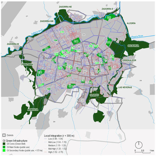 Figure 10. Local integration in terms of a 300 m radius (I0.3) for the pedestrian network of Vitoria-Gasteiz and the most relevant elements of the GI system (cores, main nodes for public use, and secondary nodes for public use that are greater than 0.5 hectares), with district limits and urban and rustic land also shown. Low, mid-low, medium, mid-high, and high classifications of local integration values are included according to quintiles.