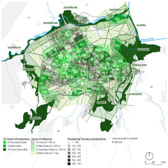 Figure 11. Areas of influence around the most relevant elements of Vitoria-Gasteiz GI: 300 m around cores, main nodes with public access, and secondary nodes with public access that are greater than 0.5 ha and 1 km around main modes with public access. A pedestrian network model (black lines) with district limits (white lines), residential density, and urban and rustic land is also included.