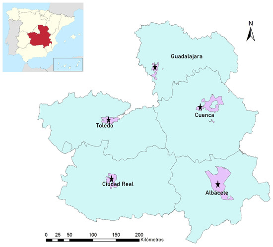 Location of the selected cities and their municipalities in the region of Castilla-La Mancha (Spain). Source: Authors’ own elaboration.
