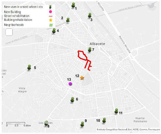 - Ayuntamiento de Albacete. EDUSI 2022. Available online: https://europa.albacete.es/es/fondo-europeo-desarrollo-regional-feder/edusi-albacete (accessed on 16 May 2023).