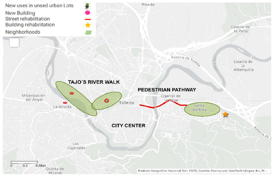 The actions related to the first of these lines (Toledo, as a compact, inclusive, and cohesive city) undoubtedly have the greatest impact on urban morphology (Figure 6), especially the regeneration and improvement of some areas of the city, bringing pedestrianization, the improvement of public spaces, the addition of bicycle paths, accessibility to the city center, and the regeneration of specific neighborhoods.