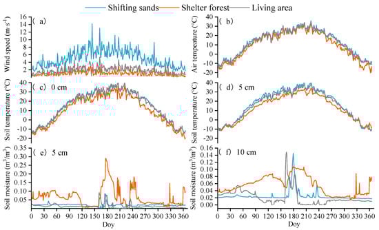 Figure 2. Simultaneous comparison of wind speed (a), air temperature (b), soil temperature (0 cm) (c), soil temperature (5 cm) (d), soil moisture (5 cm), (e) and soil moisture (10 cm) (f) for natural shifting sands, shelter forests, and living areas.
