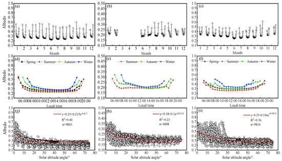 Figure 3. Characteristics of surface albedo changes in 3 different functional units. (ac) show the monthly average daily changes in surface albedo; (df) show the seasonal average daily changes in surface albedo; (gi) show the changes in surface albedo of three different functional units in relation to solar altitude angle; (a,d,g): natural shifting sands; (b,e,h): shelter forest; (c,f,i): living area. The missing spring albedo value for the shelter forest is a result of filtering out unqualified shortwave radiation data during screening, so it has not been added here.