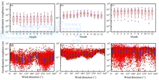 As shown in Figure 4d–f, the z0m of each functional unit fluctuates and changes under different wind conditions. The z0m values of the shifting sands become larger in the due north and south-west directions, which is related to the multiple small dunes distributed in these two directions. The shelter forest and the living area are situated amidst large sandy ridges that run in the north-east and south-west directions. This positioning leads to lower z0m values in both areas along this orientation. In this case, the data for the living area are more dispersed due to the surrounding buildings and vegetation.
