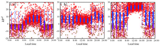 Figure 5. Daily variation characteristics of KB−1 in 3 different functional units: natural shifting sands, shelter forest, and living area, where red represents aerodynamic roughness, the top and bottom edges of the blue rectangular box indicate 75% and 25% values, respectively; the horizontal lines “-” that extend vertically from the top and bottom edges of the rectangular box indicate 90% and 10%, respectively. (a) Natural shifting sands; (b) shelter forest; (c) living area.