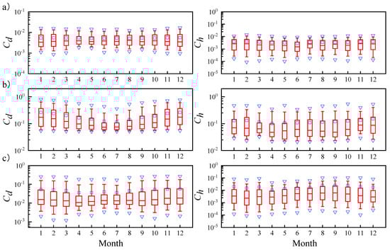 Figure 6. Month-to-month variation characteristics of the momentum exchange coefficient and sensible heat exchange coefficient for three different functional units: natural shifting sands, shelter forest, and living area. The box-line diagram expresses the same meaning as Figure 4a–c: (a) natural shifting sands; (b) shelter forest; (c) living area.