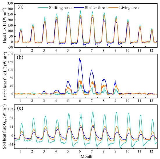 Figure 7. Comparison of monthly average daily variation in sensible heat flux H (a), latent heat flux LE (b), and soil heat flux G05 (c) for natural shifting sands, shelter forest, and living area, respectively. The missing latent heat fluxes for January and February in the figure for shelter forest are unqualified data that were filtered out during data screening, so they are not added here.