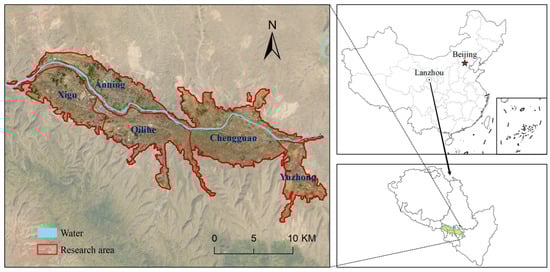 Lanzhou is located in the transition zone between the Qinghai–Tibet Plateau and the Loess Plateau, with an altitude of approximately 1520 m and covers an area of 13,100 km2. It serves as the political, cultural, economic, scientific, and educational center of Gansu, as well as an essential node city of the Silk Road Economic Belt and an significant industrial base and transportation hub in the northwest region of China. The present study employed the dataset of urban built–up areas in China [45] to investigate the built–up area in the central urban region of Lanzhou, covering five districts: the Chengguan, Qilihe, Anning, Xigu, and Yuzhong County (Figure 1). By the end of 2020, Lanzhou had a registered population of 3.34 million, among which the urban population was 2.46 million, with a built–up area of 366.84 km2 and the gross regional product was 288.674 billion yuan, where the tertiary industry accounted for 65.68%.
