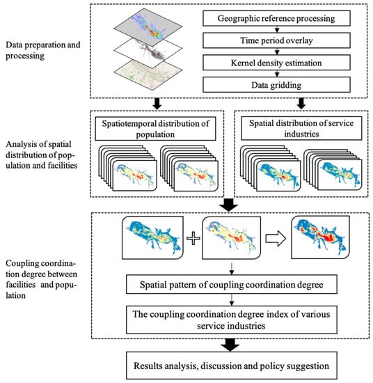 Figure 2 depicts the flowchart of the proposed spatial matching method. The method involves three primary processes: data preparation and processing, analysis of the spatial distribution of population and facilities, and coupling coordination degree between facilities and population.