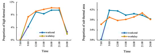 The study utilized the natural breakpoint classification to characterize the population aggregation intensity. High–aggregation areas were defined as those with heatmap values of 6 and 7, while sub–aggregation areas were those with values of 4 and 5. Proportions of population activity were computed for seven time points on both workdays and weekends, and significant temporal variations were observed (Figure 3). On workdays, population activity was lowest at 7:00 a.m. Between 7:00 and 9:00, both high–aggregation and sub–aggregation areas increased, and population activity intensity rapidly rose, reaching its first peak, marking the regularity of the morning peak for work. The working period (9:00–12:00) saw people gathering at workplaces, leading to a decrease in the proportion of sub–aggregation areas. Between 12:00 and 18:00, there was little fluctuation. After 18:00, most people got off work, went home for meals, went shopping, or engaged in other activities, which decreased the proportion of high–aggregation areas, while the proportion of sub–aggregation areas began to increase.