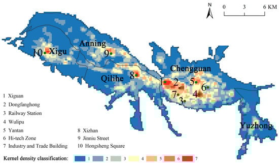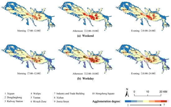In this study, the urban population density data were analyzed using Equation (2), which classified the data into three time periods: morning (7:00–12:00), afternoon (12:00–18:00), and evening (18:00–24:00) (Figure 4). The names and locations labeled as 1–10 in the figure represent the areas with high population density in the study region, which we identified using a heat map obtained from Baidu. We hypothesized that the aggregation degree is related to these representative places. Overall, these ten points have different characteristics and importance in terms of location, aggregation, and economic significance. Xiguan, Dongfanghong Square, Railway Station, Wulipu, Industry and Trade Building, Xizhan, Jinniu Street, and Hongsheng Square are all major commercial and high–foot–traffic areas in Lanzhou, while the High–tech Zone and Yantan are emerging areas in technology, high–end residential, and consumption, with important economic and social values.