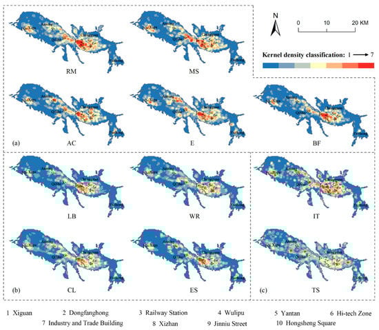 Kernel density analysis results for each service category. Type (a) showed massive aggregation around the core area of Chengguan District, with some non-contiguous aggregation in the periphery. Type (b) formed small clustered areas in the core area, with no obvious clustering characteristics in the surrounding counties. Type (c) clustered in a point-like manner within the study area.