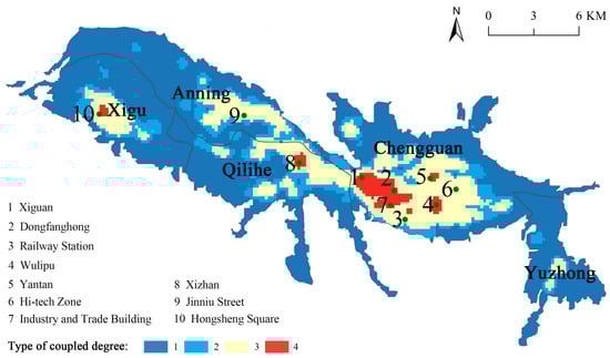 Formulas (3)–(5) were utilized to compute the degree of coupling coordination between urban population density and service facilities. Based on the work of Ma (2013) and Lv (2016) [51,52], we classified the results into four types: low–level coordination, medium coordination, good coordination, and extreme coordination, using a gradient of 0, 0.3, 0.5, 0.8, and 1. The classification results were visualized using a color map, where each color represents a different degree of coupling. Figure 7 presents the coupling coordination degree map of the overall service factor and population density. There was a significant spatial differentiation in the coupling coordination between the population activities and service facilities in the main urban area of Lanzhou, with high coordination in the middle and low coordination in the surrounding areas, which decreased from inside to outside. The areas of extreme coordination mainly formed three centers in the Chengguan District, Qilihe District, and Xigu District, corresponding to the core urban commercial areas. The good coordination area mainly revolved around the three central peripheries formed by the extreme coordination areas, followed by the Anning District and the central part of Yuzhong County, which was the transitional area between the commercial core area and the periphery. The medium coordination areas were distributed in a ring or as points on the periphery of the good coordination areas, which was the transition area between the central area of the city and the suburbs. The low–level coordination areas were distributed in the outermost part of the built–up area, and most were located in the suburbs.